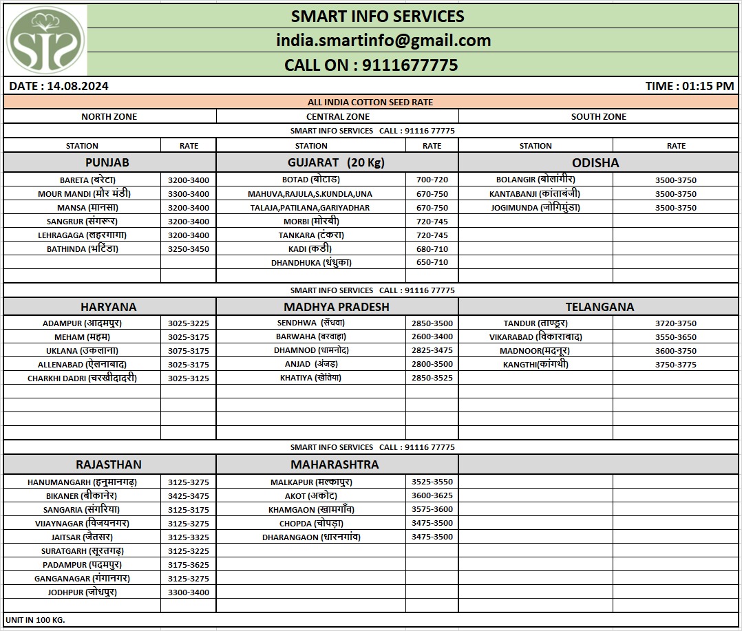 कपास विश्लेषक नसीम उस्मान ने बताया कि सिंध में कपास की नई फसल का रेट 20,400 रुपये से 20,500 रुपये प्रति मन है. सिंध में फूटी का रेट 9,200 रुपये से 10,200 रुपये प्रति 40 किलो के बीच है। पंजाब में कपास की दर 20,500 रुपये से 21,000 रुपये प्रति मन है और फूटी की दर 10,400 रुपये से 10,500 रुपये प्रति 40 किलोग्राम है।