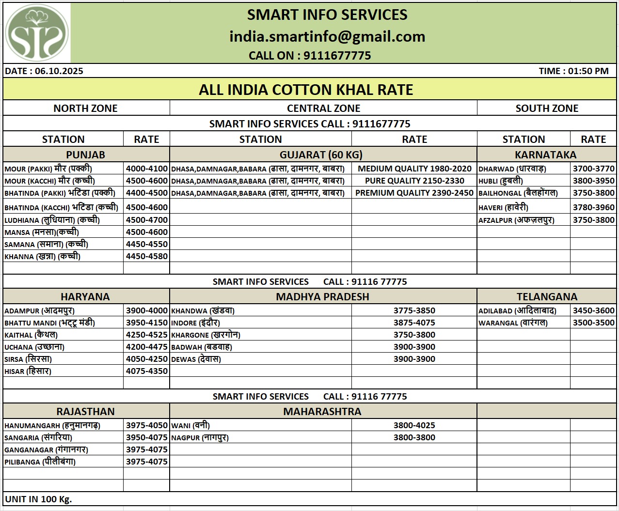 कपास विश्लेषक नसीम उस्मान ने बताया कि सिंध में कपास की नई फसल की दर 19,400 रुपये से 19,500 रुपये प्रति मन है। सिंध में फूटी का रेट 7,500 रुपये से 9,000 रुपये प्रति 40 किलो के बीच है. पंजाब में कपास की दर 19,200 रुपये से 20,000 रुपये प्रति मन और फूटी की दर 7,500 रुपये से 9,200 रुपये प्रति 40 किलोग्राम के बीच है। बलूचिस्तान में कपास की दर 19,400 रुपये से 19,500 रुपये प्रति मन है जबकि फूटी की दर 8,200 रुपये से 9,300 रुपये प्रति 40 किलोग्राम के बीच है।