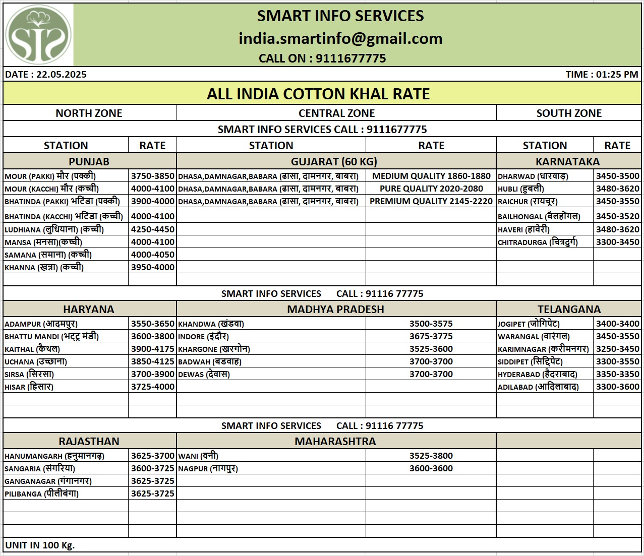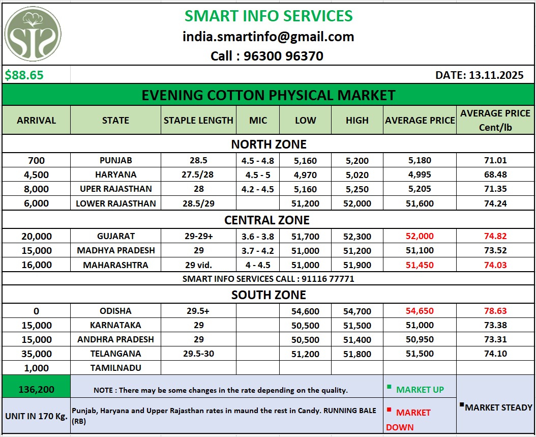 आज दोपहर करीब 12 बजे सीसीआई के कॉटन सिलेक्टर अरुण ने क्षेत्र के किसान निर्भय सिंह से 7689 रुपये प्रति क्विंटल के भाव पर कपास की पहली खरीद की। मंडी सचिव अनिल उजले से मिली जानकारी के अनुसार, आज कुल 17 स्लॉट बुक किए गए थे, जिनमें से 13 किसानों का कपास सीसीआई ने खरीदा। खरीद का रेट 7689 रुपए से 8010 रुपये प्रति क्विंटल तक रहा।