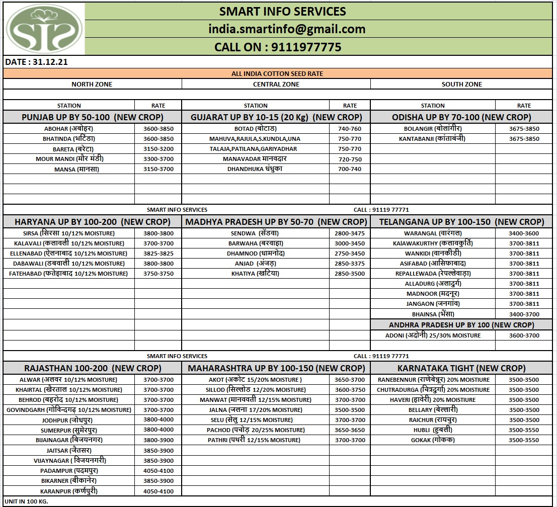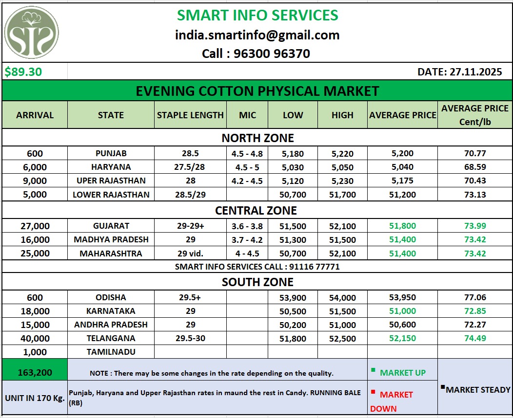 कच्चे कपास की कीमतें MSP (₹5,500–7,000 प्रति क्विंटल) से नीचे चल रही हैं। उत्तरी राज्यों में हालिया बारिश से रेशे की गुणवत्ता भी प्रभावित हुई है।