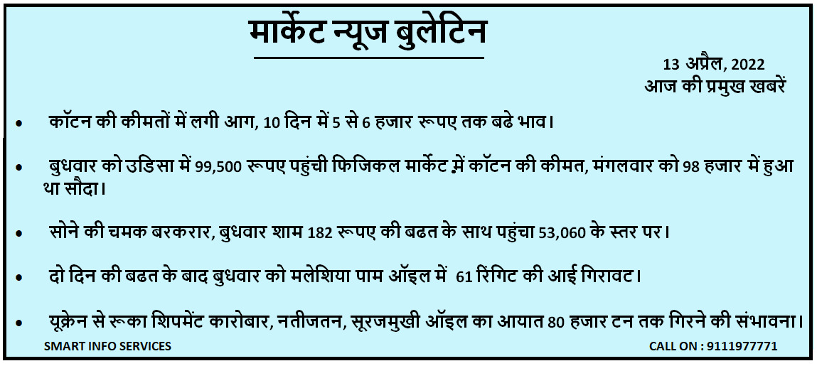 Cotton prices caught fire, increased by Rs 5 to 6 thousand in 10 days. On Wednesday, the price of cotton in the physical market reached Rs.99,500 in Odisha, on Tuesday it was Rs.98 thousand. was the deal. Gold shines intact, reaching the level of 53,060 with a gain of Rs 182 on Wednesday evening. Malaysia Palm Oil fell by 61 ringgit on Wednesday after two days of gains. · Shipment business from Ukraine stopped, as a result, sunflower oil imports likely to fall by 80 thousand tonnes.·