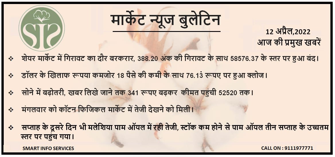 The downward trend in the stock market continued, with a fall of 388.20 points, it closed at the level of 58576.37. The rupee weakened against the dollar by 18 paise to close at Rs 76.13. Increase in gold, till the writing of the news, the price increased by Rs 341 to 52520. On Tuesday, there was a rally in the cotton physical market. On the second day of the week also, there was a rise in Malaysia Palm Oil, the stock decreased, Palm Oil reached the highest of three weeks. level reached.