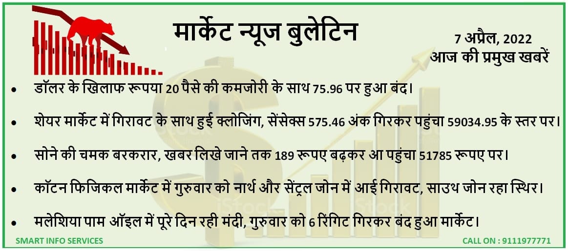 The rupee declined by 20 paise to close at 75.96 against the dollar. The closing took place with a fall in the stock market, the Sensex fell 575.46 points to reach the level of 59034.95. Gold shine intact, till the writing of the news, it rose by Rs 189 to Rs 51785. The decline in the North and Central Zone in the Cotton Physical Market on Thursday, South Zone remained stable. Malaysia Palm Oil remained bearish for the whole day, the market closed after falling 6 ringgit on Thursday.